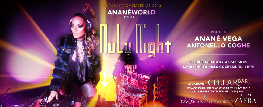 AnanesWorld Presents NuLu Nights with myself and Antonello Coghe….if you missed the last one, here’s your chance to come try our “NuLu Drink” and listen to the sounds of NuLu Music…we also offer special birthday packages for anyone celebrating their special day…$75…champagne…gourmet cake…balloons…sparklers and a special Molton Browne gift set…see you all there